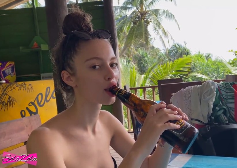 Парочка прилетела на отдых в тропическую страну. Во время посиделки в баре, девка стала намекать парню на минет. Она стала заглатывать трубочку от коктейля, а потом и горлышко бутылки. Ребята уединились на природе, спрятавшись среди растительности и деваха стала быстро отсасывать парню, пока тот не кончил ей прямо в рот.
