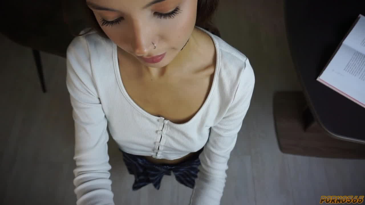 Девица сидела за книгой, когда к ней подошёл парень. Она пожаловалась, что учёба никак не идёт. Тогда бойфренд предложил студентке немного отвлечься. Он достал член, а та упала на колени и принялась сосать. После встала раком и подставила дырочку. Уж после соития-то должно пойти получше, только животик от кончи отмыть и дальше учиться.